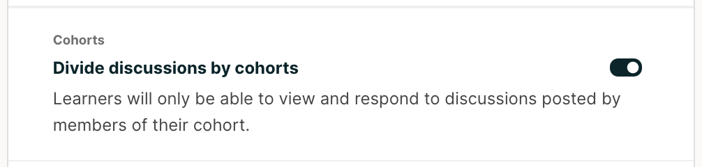 1. Turn on the toggle for Divide discussions by cohort to divide all content-specific discussion topics by cohort.
