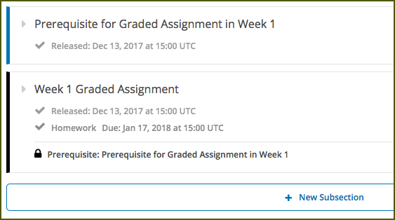 Make sure that you configure subsection prerequisites in the order that you intend for learners to encounter them in the course content. The prerequisite configuration controls do not prevent you from creating a circular chain of prerequisites that will permanently hide them from learners.