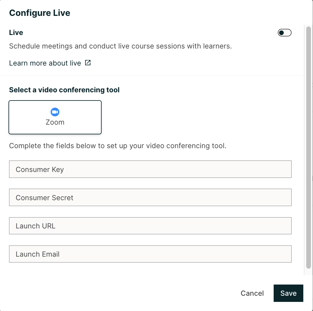 Zoom LTI pro app can be used to integrate Zoom video conferencing at the course level. Course authors will need to generate their own credentials for the Zoom LTI pro app and add those credentials in Live app configuration for Zoom.