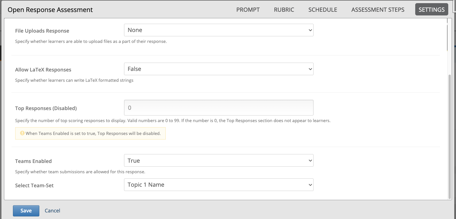 To make a Team ORA, set the option Teams Enabled to True. This reveals a dropdown for the Selected Team set that defines which group of teams will be able to submit a response for this assignment.