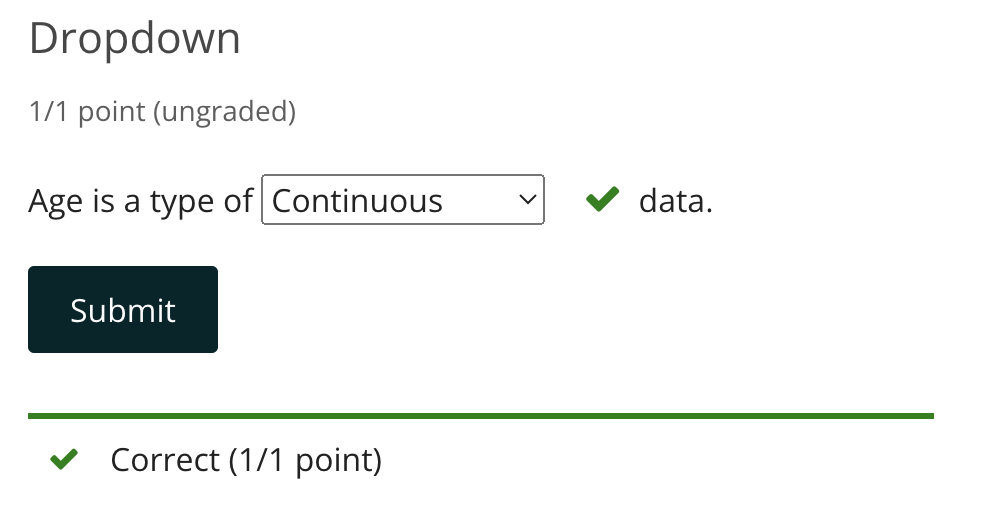 The above sentence with an in-line dropdown box with the options "Nominal", "Discrete", and "Continuous"