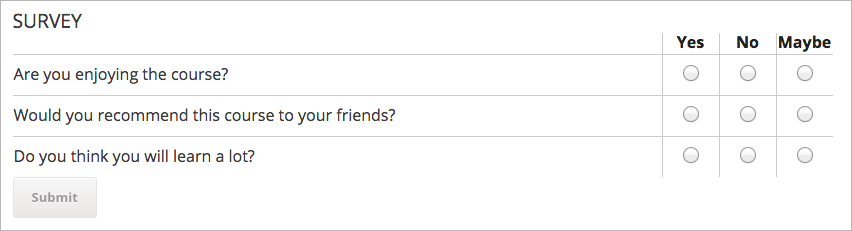 8. Configure answers for the survey. Each answer is displayed to learners as a column, with a radio button they can select. Each answer is used for each survey question.