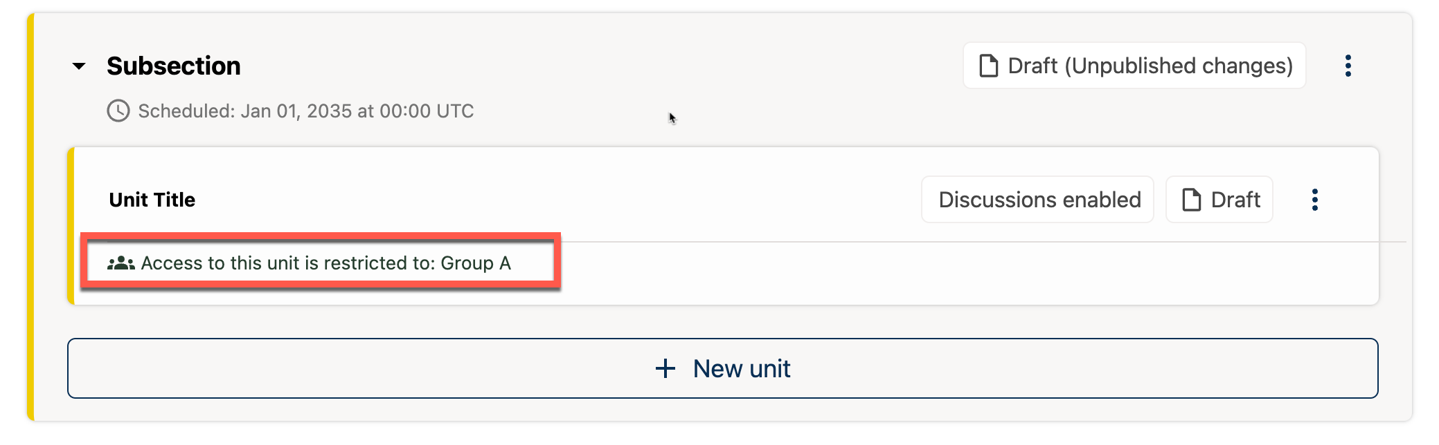 When a unit has restricted access, a message listing the groups which have access to a unit appears under the unit title in the Studio course outline.