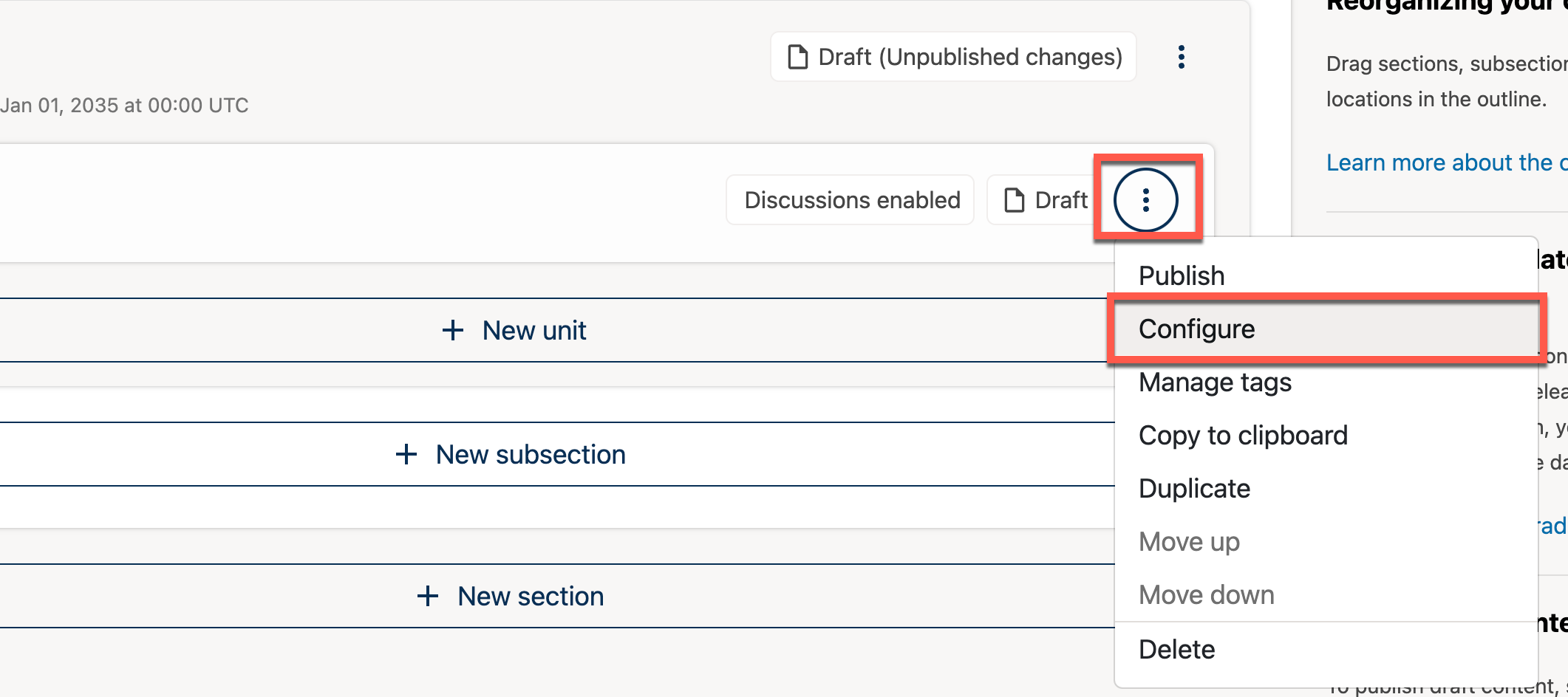 The vertical dots icon and configure option highlightedin a unit's toolbar in the Studio course outline.