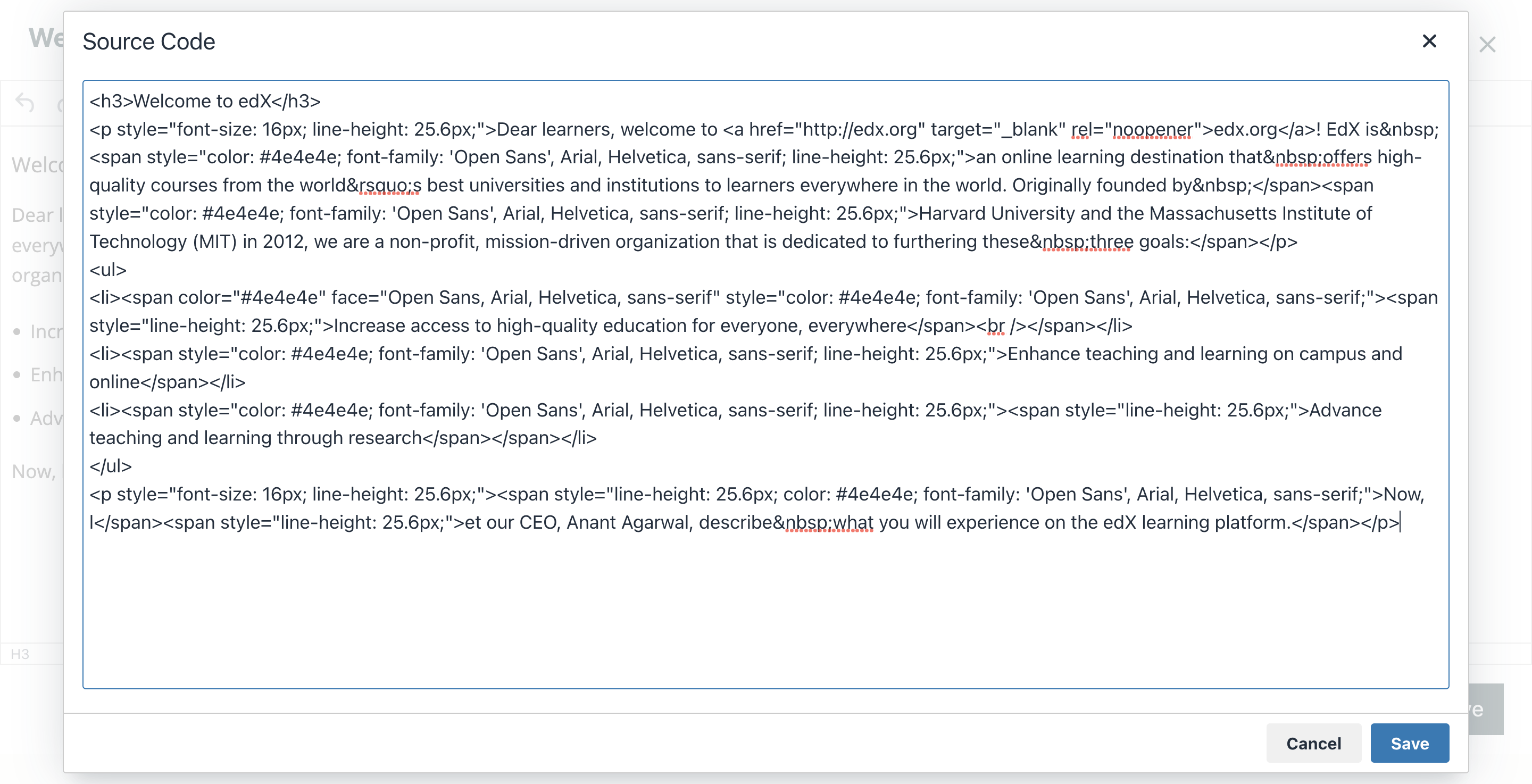 Selecting OK in the source code editor does not save your changes to the Text component. To save your changes and close the component, select Save in the visual editor. If you select Cancel, the changes you made in the HTML source code editor are discarded.