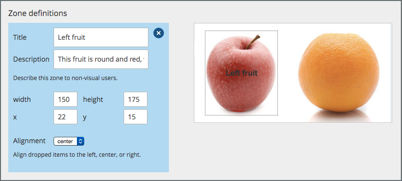 A target zone is a rectangular area on the background image. You can show or hide the borders of a zone for learners. You can add titles for zones or leave the Title field empty. However, you must fill in the Description field for each zone. The description is only exposed to screen readers. The description must describe the content of the zone for visually impaired learners. For example, a zone that includes an apple might have a description that says “A round, red fruit with a stem.”
