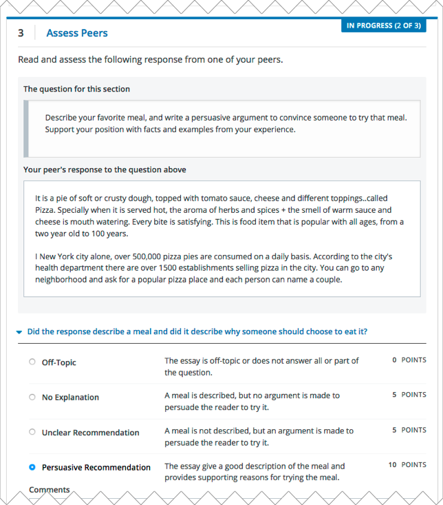 In addition to a field for overall comments on a learner’s response, some peer assessments include Comments fields for individual criteria that allow you to enter up to 300 characters. In some assessments, you must enter comments before you can submit the assessment.