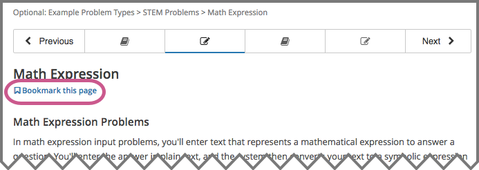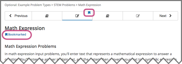 After you add a bookmark, Bookmark this page changes to Bookmarked, and an indicator appears in the unit navigation bar.