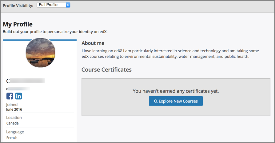 Your personal profile allows you to optionally share information about yourself with other participants in the courses that you take. If you choose to add profile information, course teams and other learners in your courses can view the information that you share.