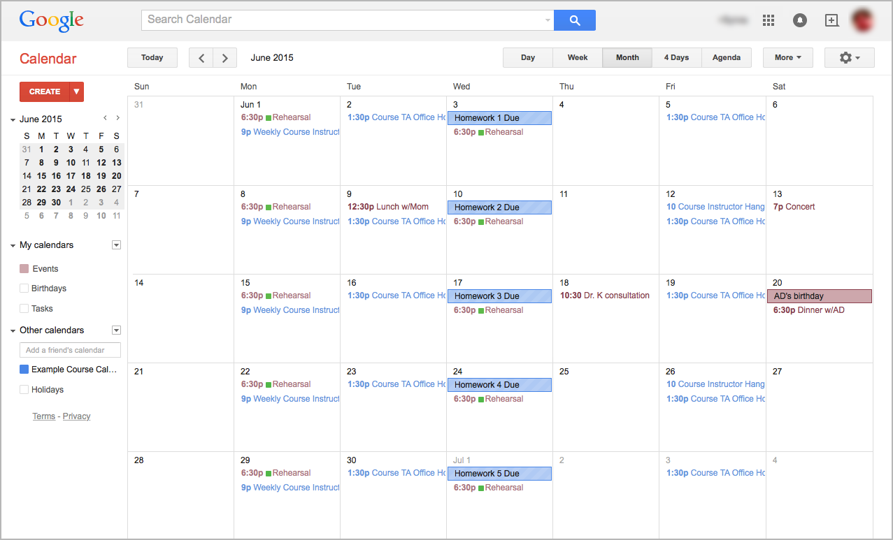 If you have your own Google calendar, you can add the Google calendar from a course to it. After you add a calendar, you see that calendar whenever you view your personal calendar, even if you are not signed in to your account. The course information appears together with your own information.