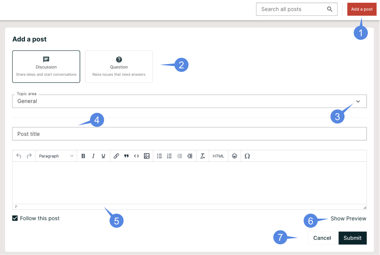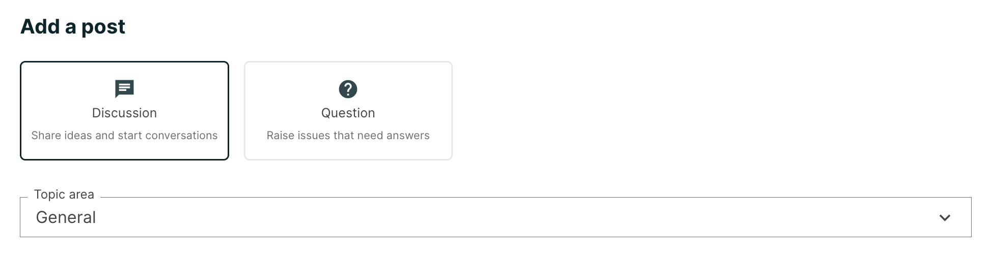 To make sure that other learners and the course team can find and respond to your post, decide what type of post you want to make: either question or discussion.