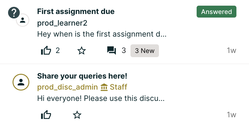 If you have any difficulty deciding which type of post you want to add, think about whether you want to get concrete information (a question) or start an open-ended conversation (a discussion). If you are asking a question about the course and need an answer from the course team, be sure to create your post as a question, so that the course team sees that a response is required and responds appropriately.