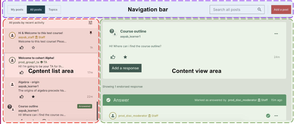 Content list area: List of posts, learners, topics, search results etc.