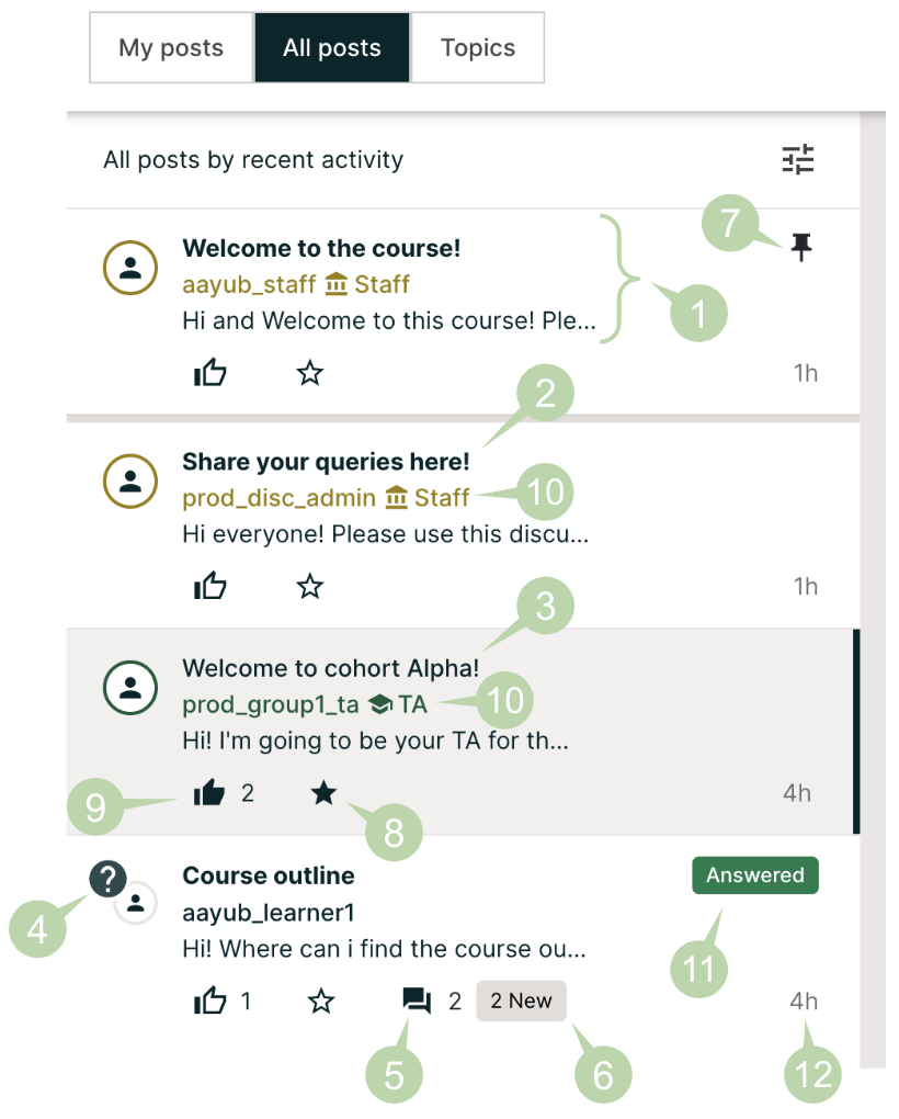Every post is associated with a topic, chosen from the list of topics created by the course team. For information about topics, see Discussion Topics.